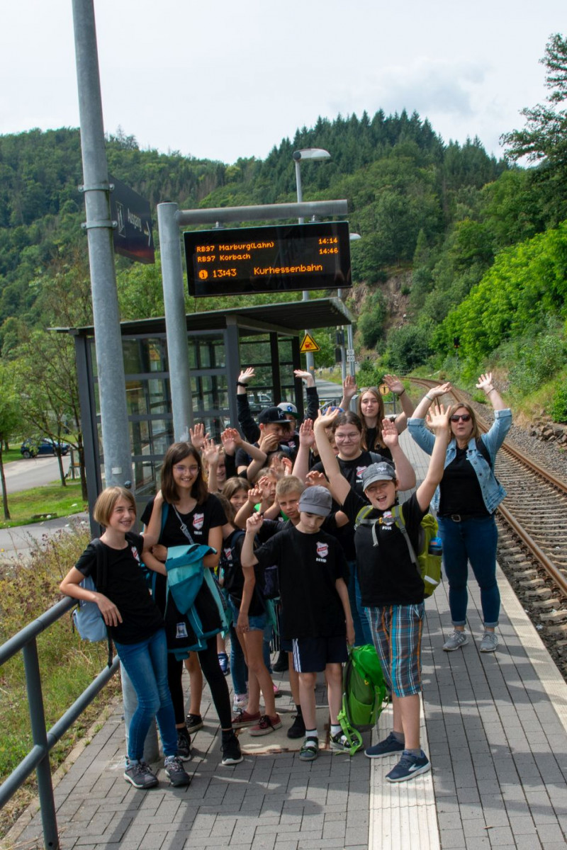 Nach einem etwas holprigem Start (Schienenersatzverkehr und Krankheit) kam die Gruppe, mit etwa einer Stunde Verspätung, in Herzhausen an. Am Bahnhof, empfangen von Christoph und Stefan, die schon am Tag zuvor einiges vorbereitet hatten, machten sich Paul, Lea, Emma, Zoe, Sophie, Mia, Johanna, Mia, Cara, Leander, Jonas, Lukas, David, Timon, und Felia in Begleitung von Nicole, Selina und Maren auf den Fußweg zum Zeltplatz. Nach einer kleinen Stärkung wurden erfolgreich alle Zelte aufgebaut und die Schlafplätze gemütlich eingerichtet. Am Abend kamen schließlich auch noch Silke und Valentina nach, so dass wir endlich komplett waren.